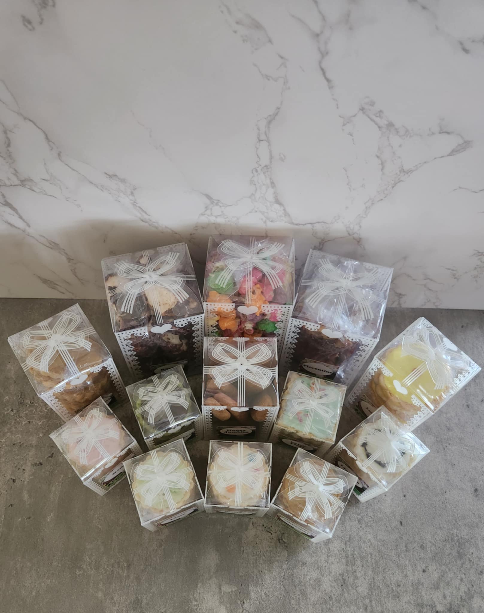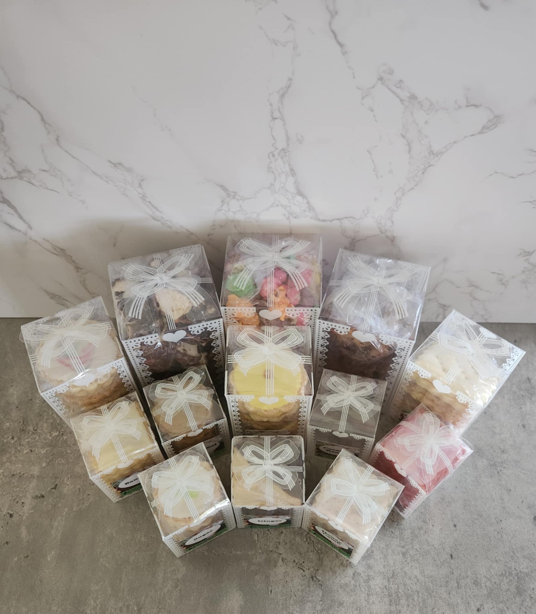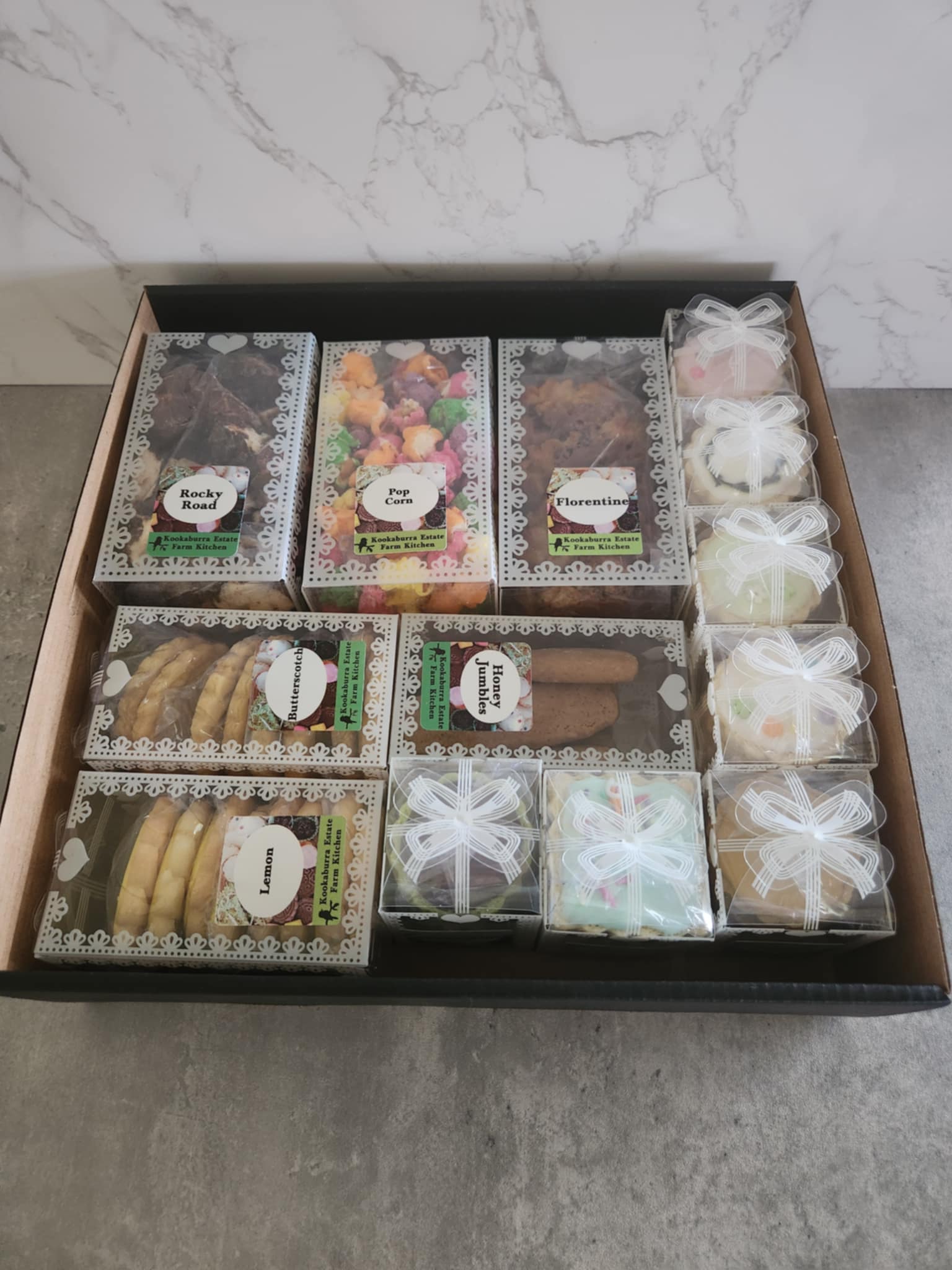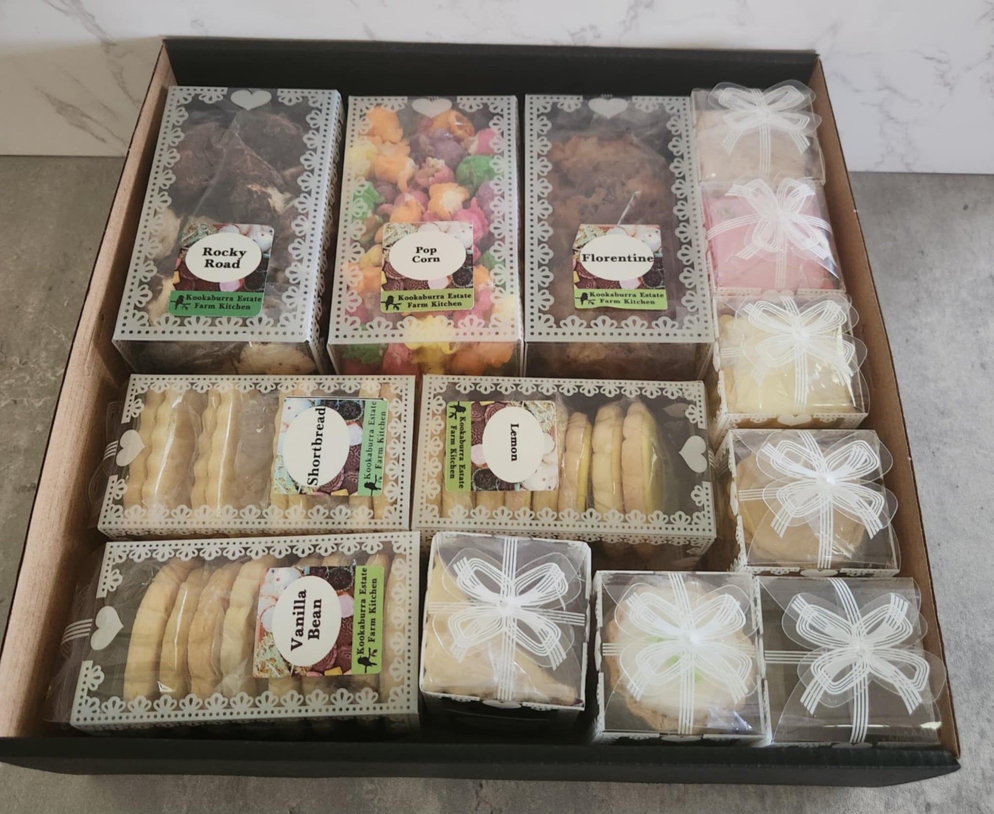 6 Honeycomb Biscuits, 6 Raspberry Biscuits, 6 Chocolate Ginger Biscuits, 6 Sugar Biscuits, 5 Coconut Biscuits, 6 Banana Biscuits, 6 Caramel Biscuits, 5 Florentine Biscuits, 8 Lemon Biscuits, 8 Vanilla Bean Biscuits, 8 Large Shortbread, Large Individually Wrapped Lollies, Large Rocky Road