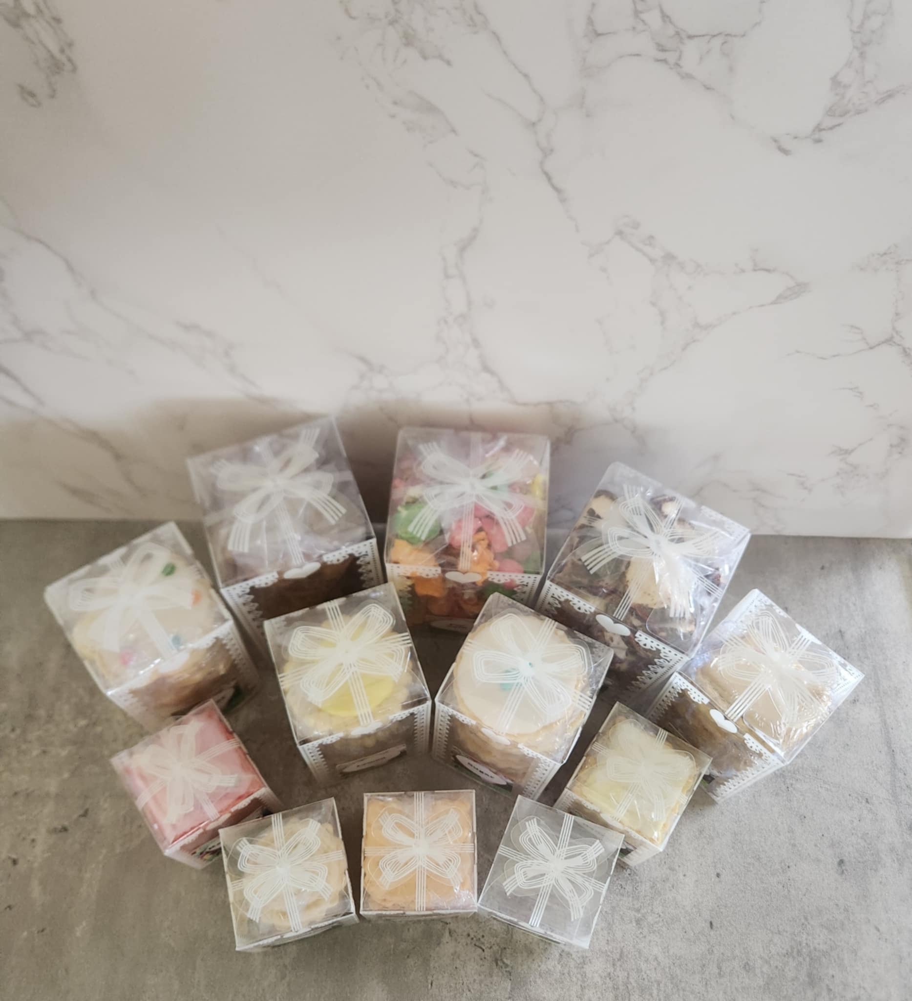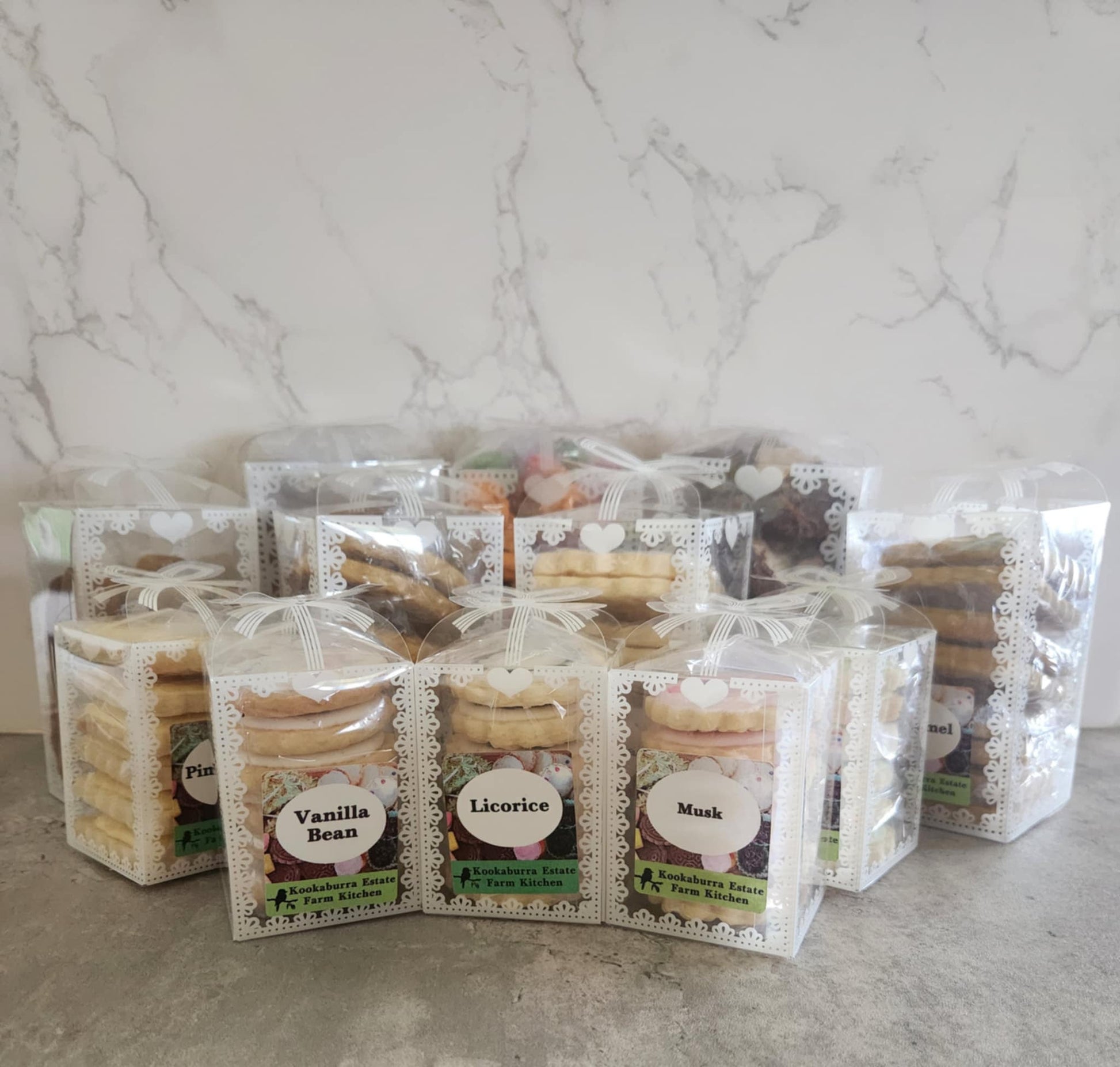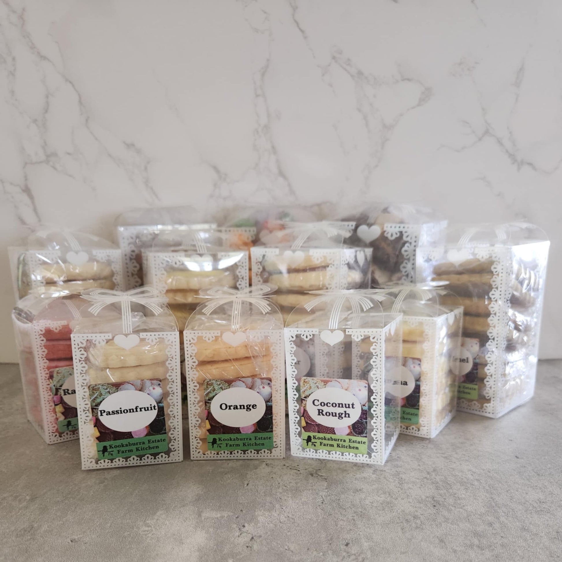 Box 1 Contains: 8 Vanilla Bean Biscuits, 8 Lemon Biscuits, 8 Honeycomb Biscuits, 8 Butterscotch Biscuits, 6 Toffee Apple Biscuits, 6 Orange Biscuits, 6 Cookies n Cream Biscuits, 5 Sugar Biscuits, 6 Raspberry Biscuits. 10 Extra Large Shortbread Biscuits, Large Individually Wrapped Lollies and Rocky Road,