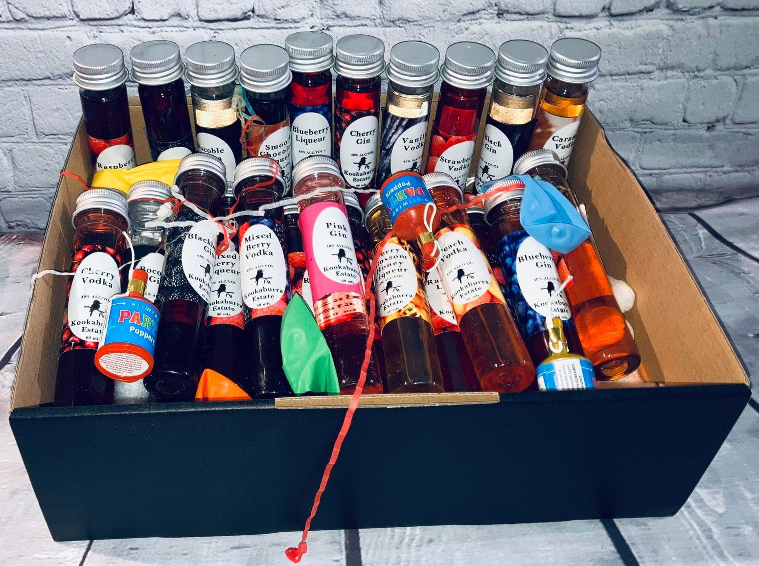 Get ready to elevate your celebrations with the Party Time Liquor Pack from Kookaburra Estate! This ultimate party starter features 33 unique flavors of gin, vodka, and liqueurs, all conveniently packaged in 60ml (two-shot) test tubes or glass bottles. Perfect for any occasion, whether it’s an 18th birthday, a hen's night, or just a fun get-together with friends.