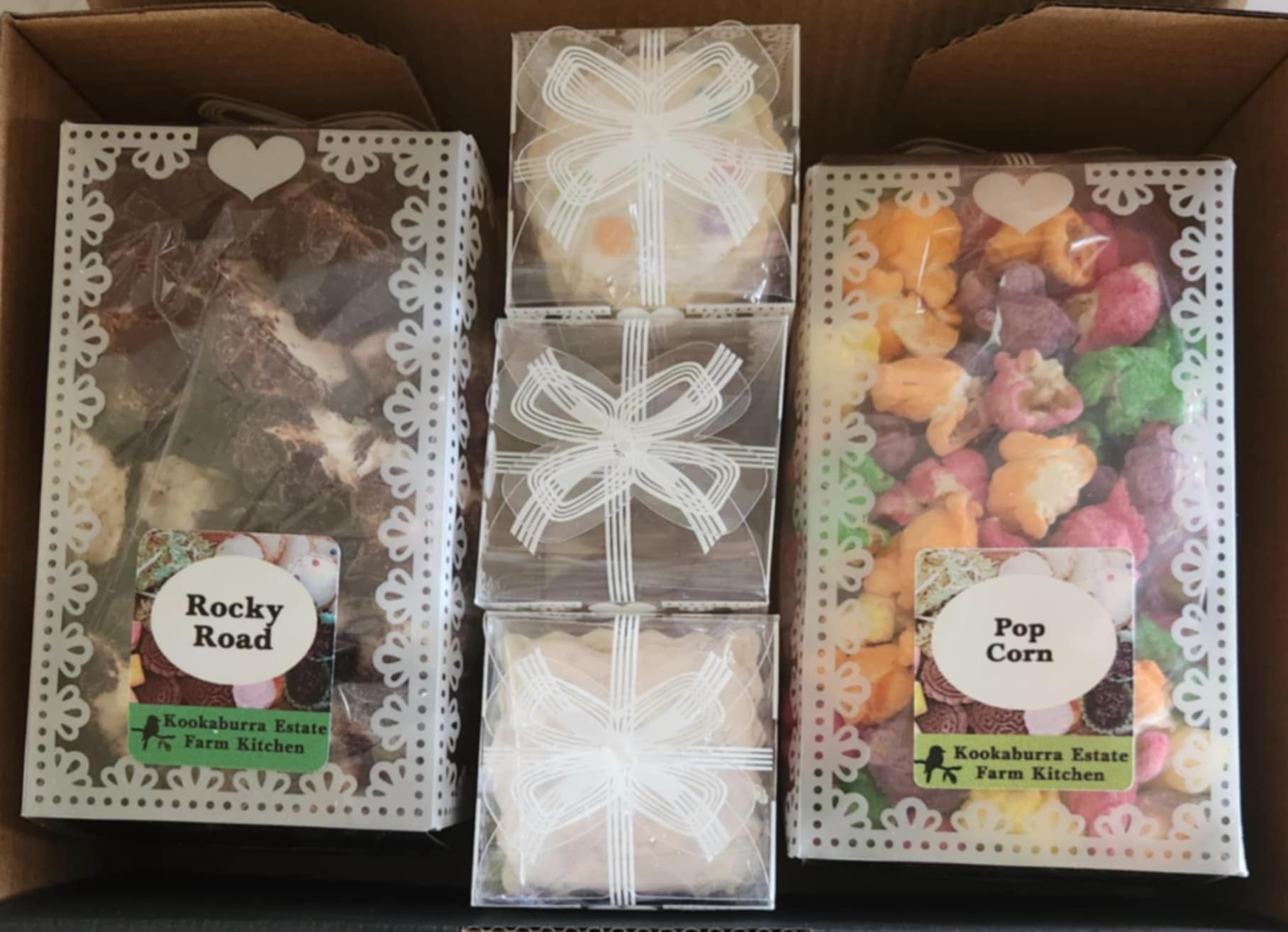 6 Musk Biscuits, 6 Butter Biscuits, 6 Passionfruit Biscuits. Large Rocky Road, Large Individually Wrapped Lollies