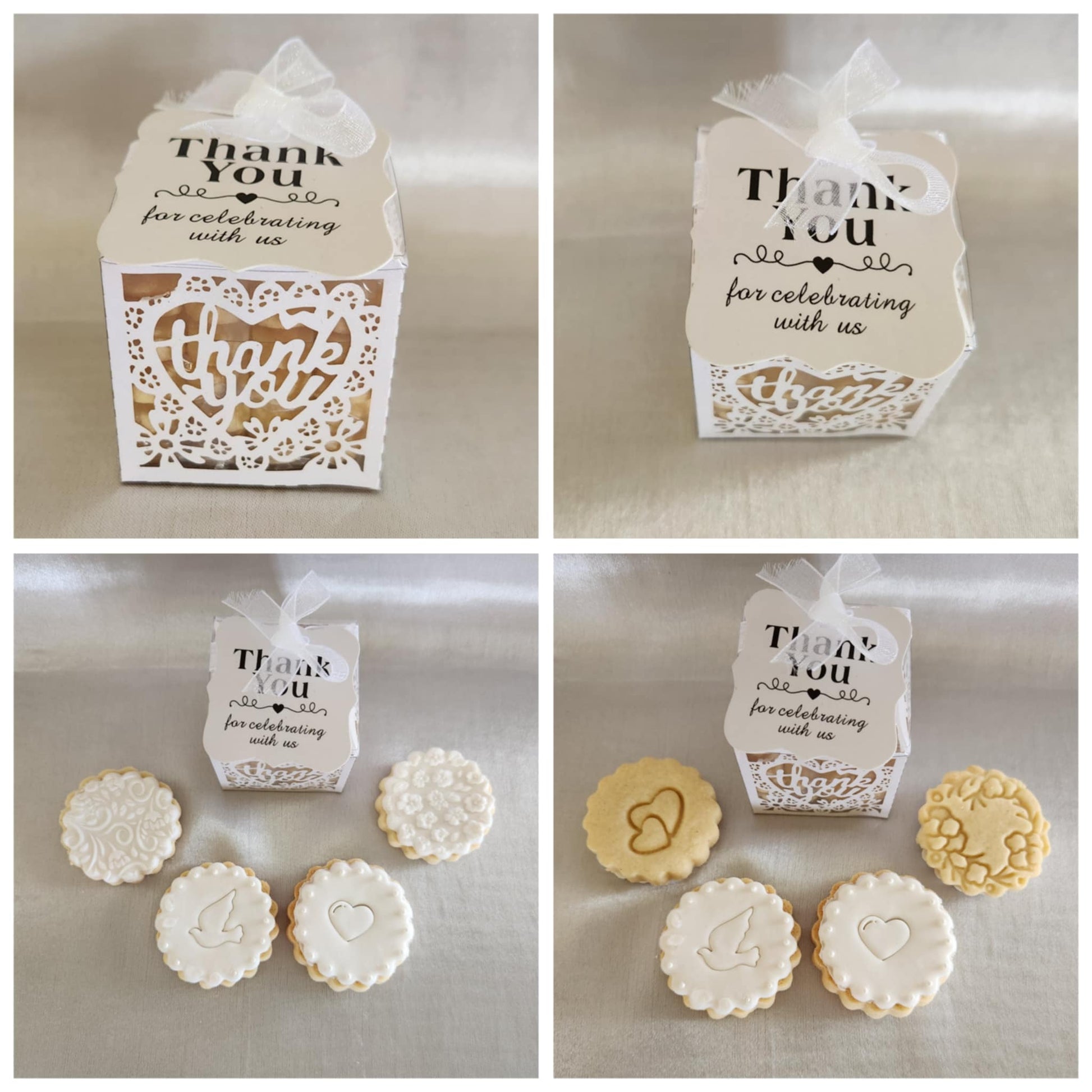 Double Vanilla, double sided approx 5cm. four shrink wrapped biscuits packed in a little thank you box, with a card. The card is blank on the back, so these little boxes can be used for table seating.